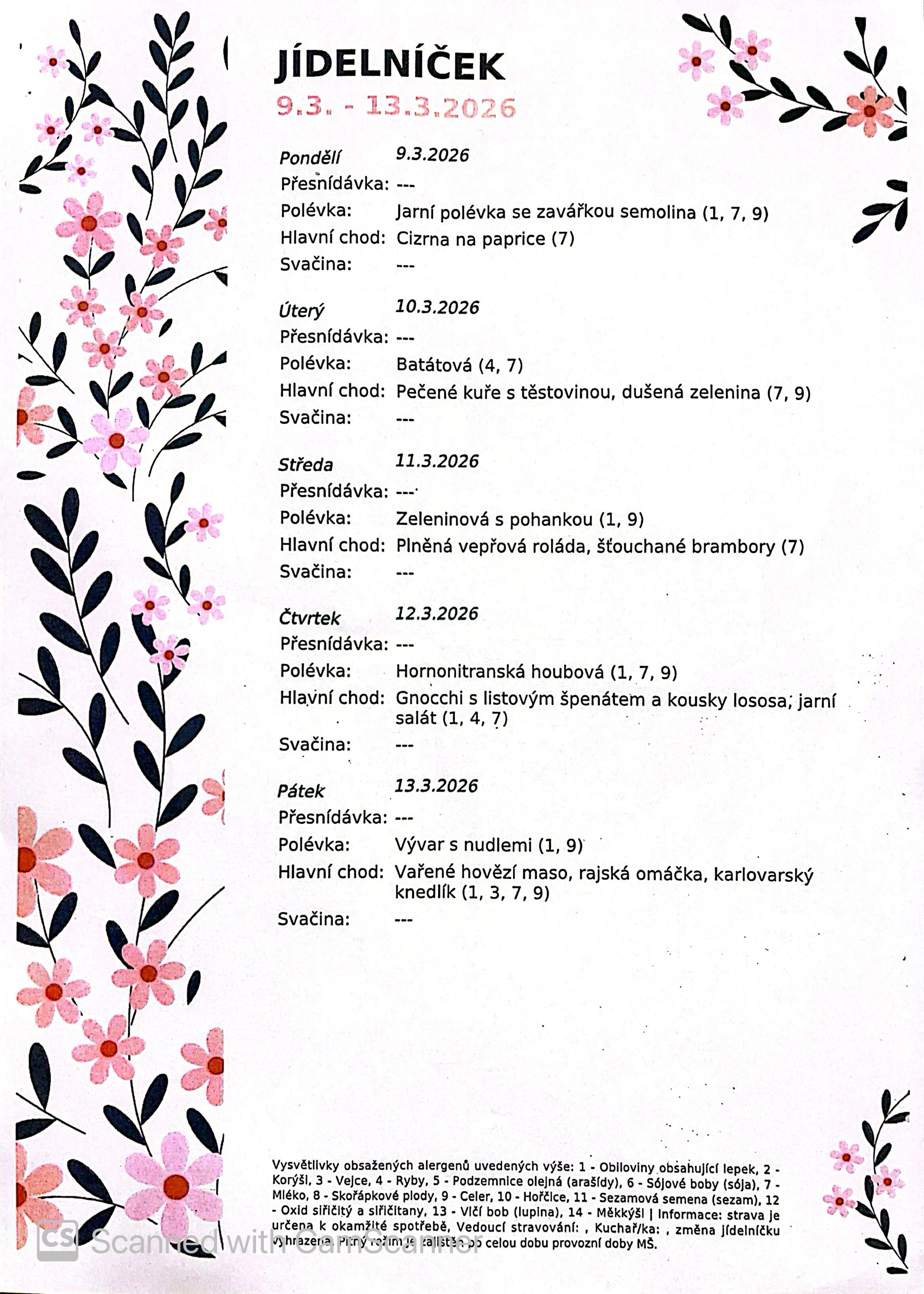 Jídelní lístek od 9.3.2026